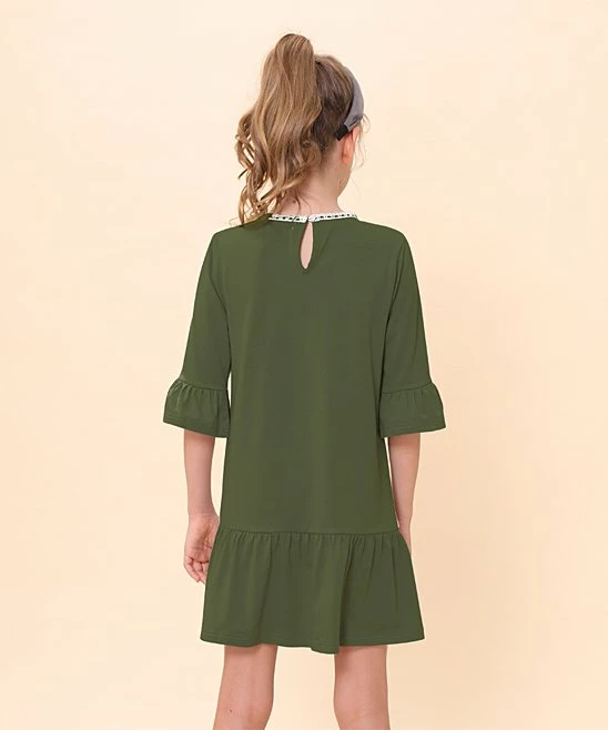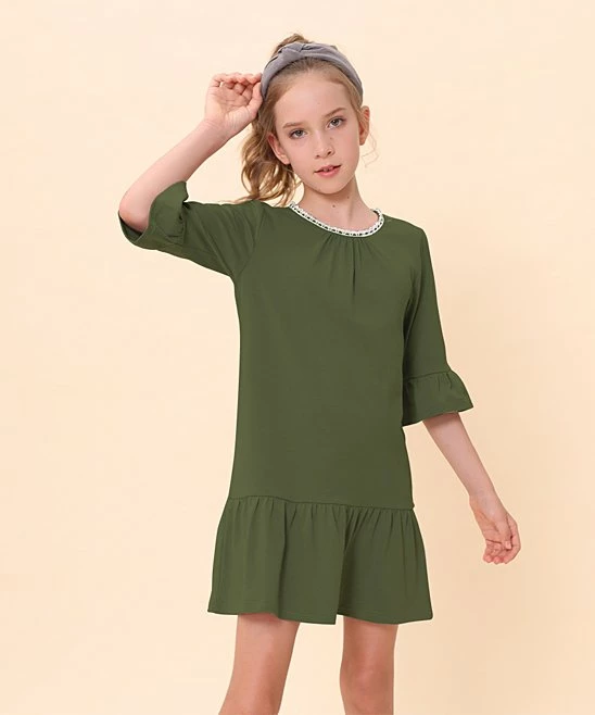 Promo 😍 Trend Blossoms Army Green Bell-Sleeve Ruffle-Hem Shift 👗 Dress – 👧 Girls ⌛
