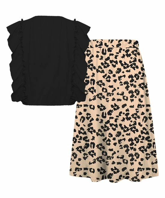 - Includes black angel sleeve top and apricot leopard maxi skirt (two pieces total)