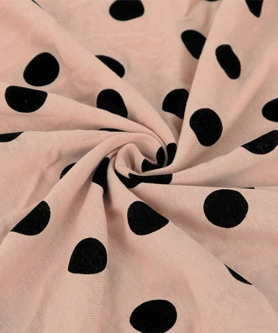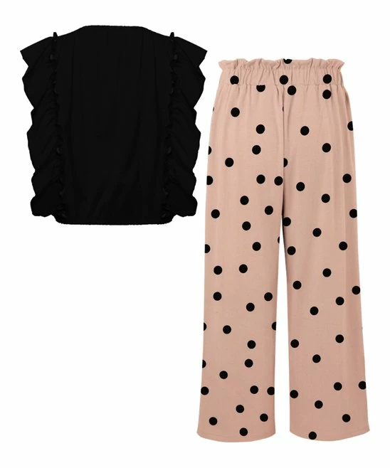 - Includes black angel-sleeve top and light pink and black polka dot wide-leg pants (two pieces total)