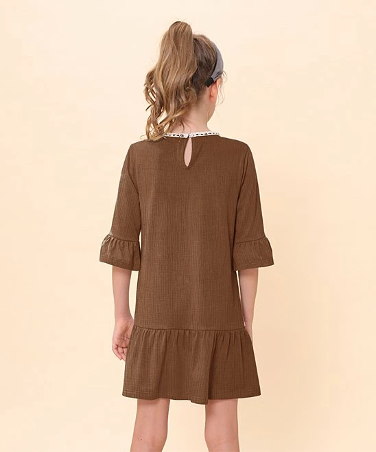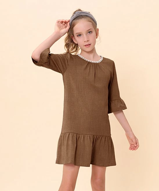 Breathable cotton fabric and a shift profile bring an effortless feel to this ruffle-accented three-quarter sleeve dress.