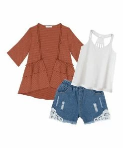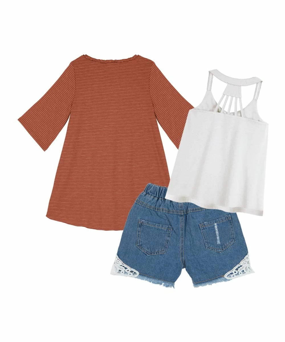 - Includes burnt orange stripe cardigan, white tank and blue shorts (three pieces total)