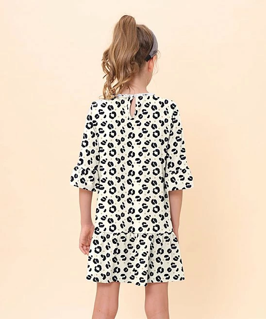Ruffles accent the hem and three-quarter sleeves of this shift dress.