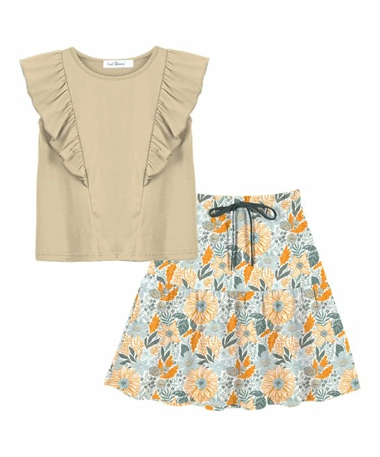 Budget 👍 Trend Blossoms Cream Ruffle Sleeveless Top & Dusty Turquoise Floral Leaf Bow-accent 👗 Skirt – 👧 Girls ⌛