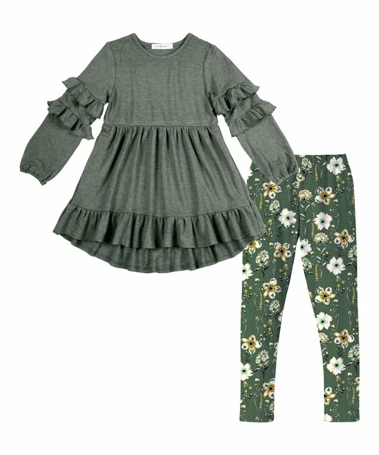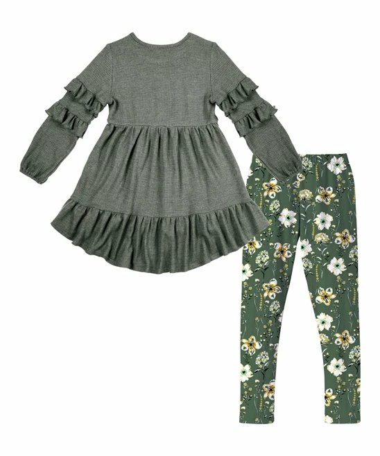 - Includes dark green top and floral leggings (two pieces total)