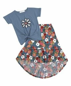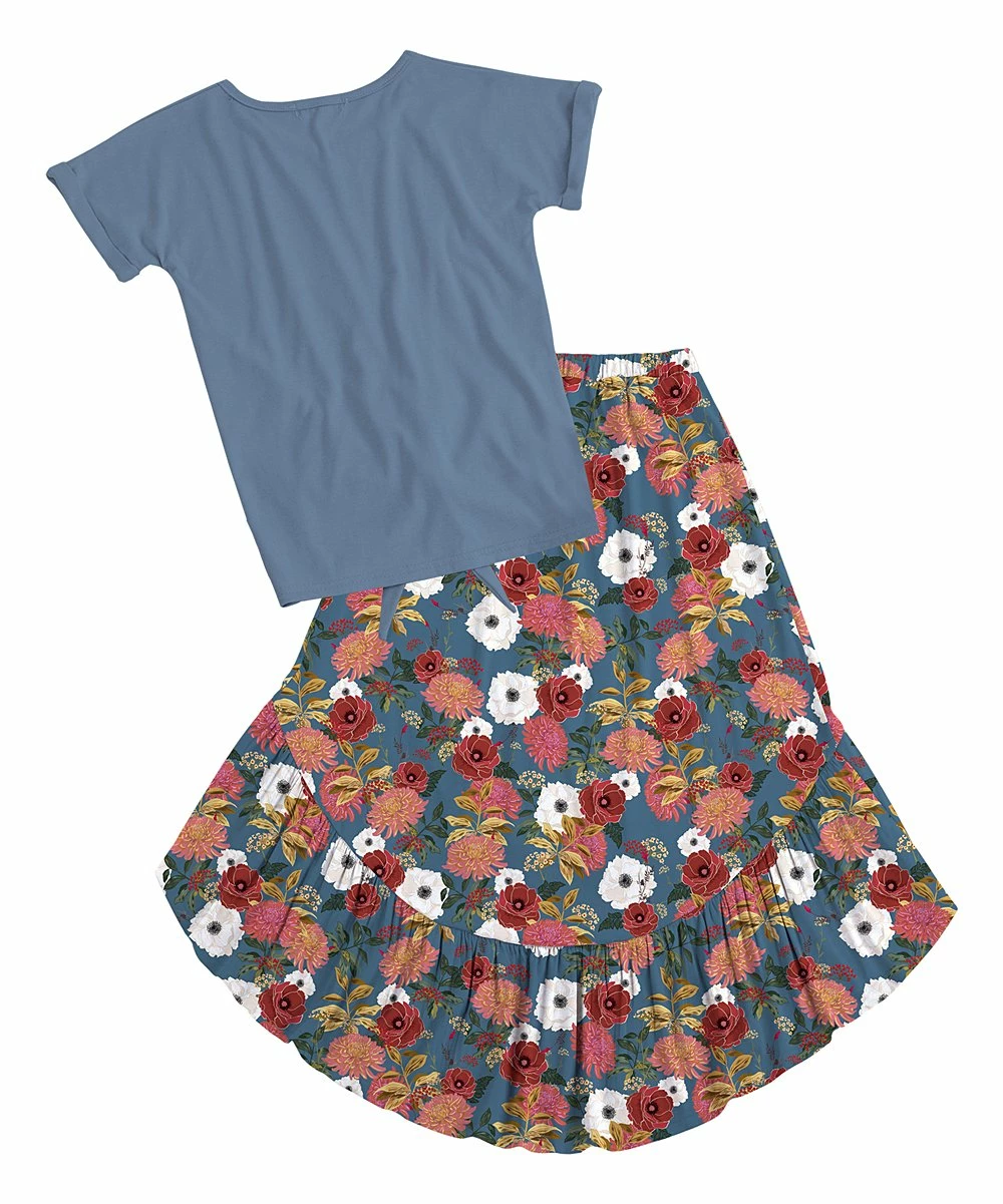 - Includes a dusty blue knot-front top and a dusty blue floral hi-low skirt (two pieces total)