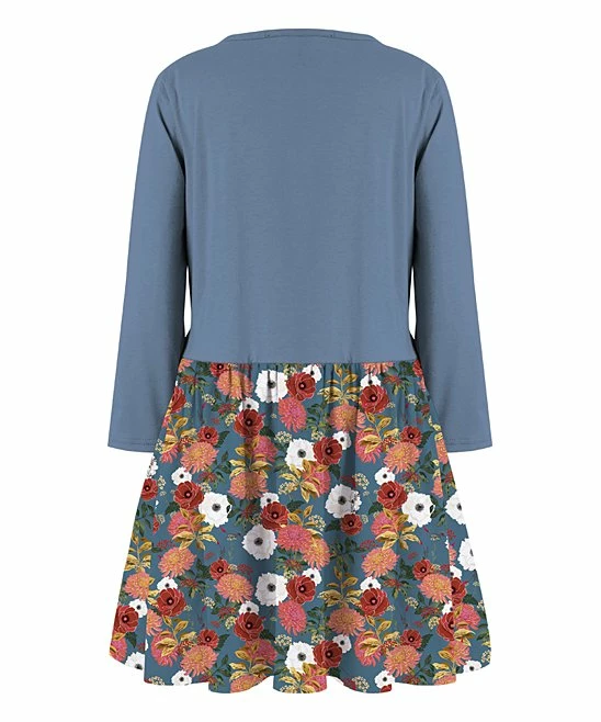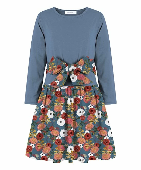 This long-sleeve A-line dress is designed with a bold bow accent and a printed skirt.