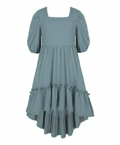 Get kids all dressed up with square neckline, puffed half sleeves and flouncy asymmetrical hem of this peasant dress.