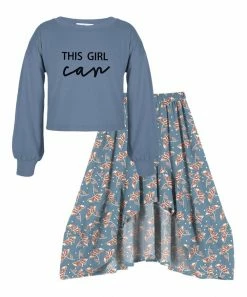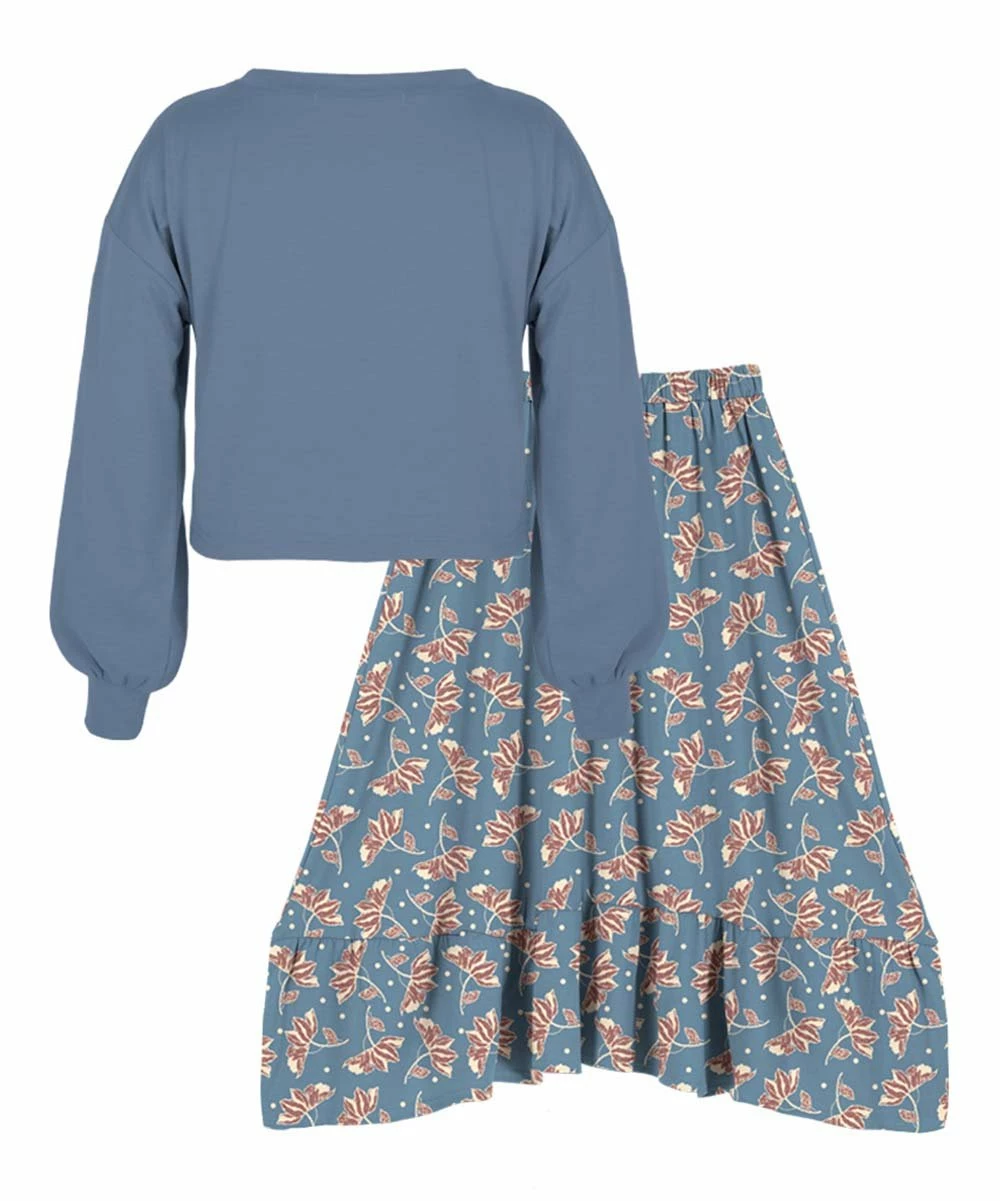 - Includes dusty blue top and blue floral skirt (two pieces total)