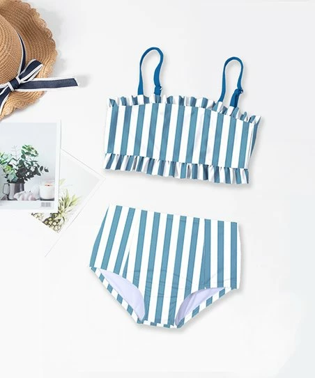 - Includes dusty blue and white stripe tankini top and matching bikini bottoms (two pieces total)