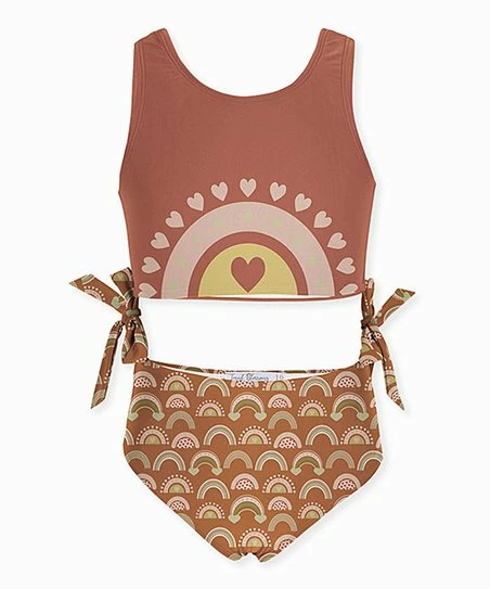 - Includes dusty coral rainbow bikini top and orange rainbow bottoms (two pieces total)