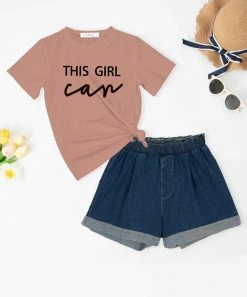 Dress kids in a coordinated look with this 100% graphic tee and high-waist denim shorts with cuffed hems.
