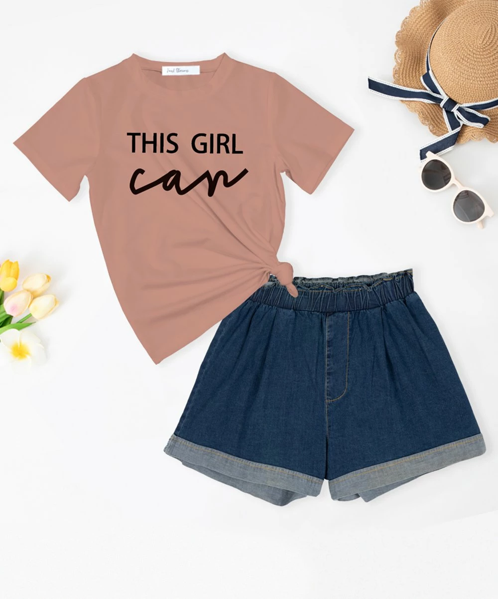- Includes one dusty coral graphic crewneck tee and one pair of dark blue denim shorts (two pieces total)