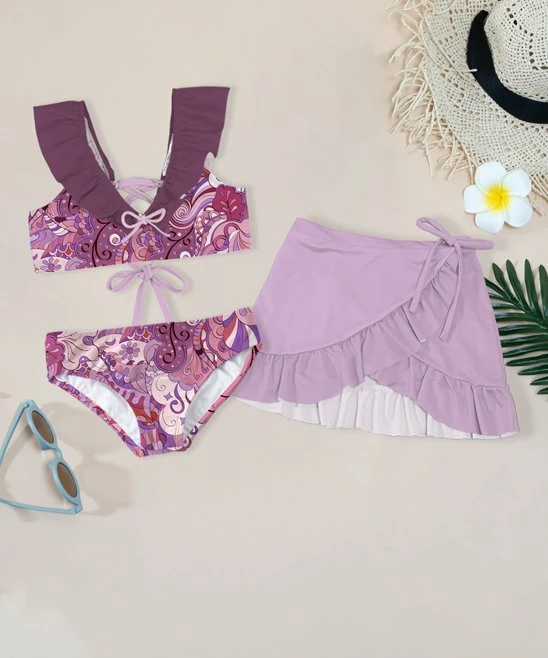 - Includes dusty pink floral bikini top, dusty pink floral bikini bottoms and dusty orchid swim skirt (three pieces total)