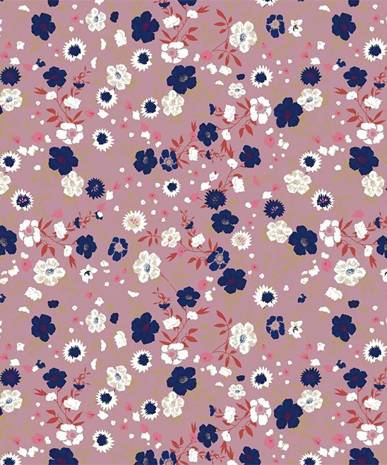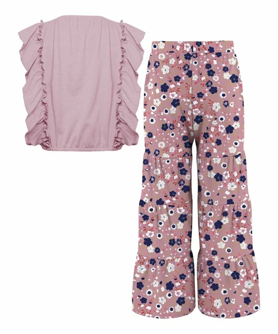 - Includes dusty pink angel-sleeve top and navy floral tiered pants (two pieces total)