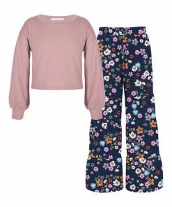 - Includes dusty pink solid puff-sleeve top and navy floral flare pants (two pieces total)