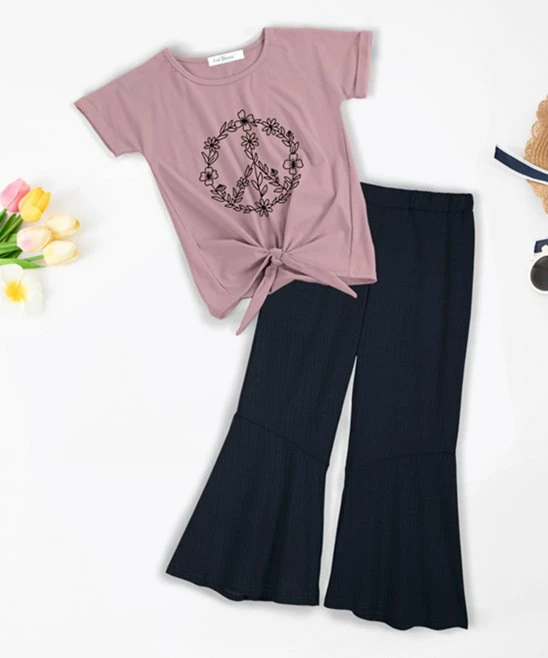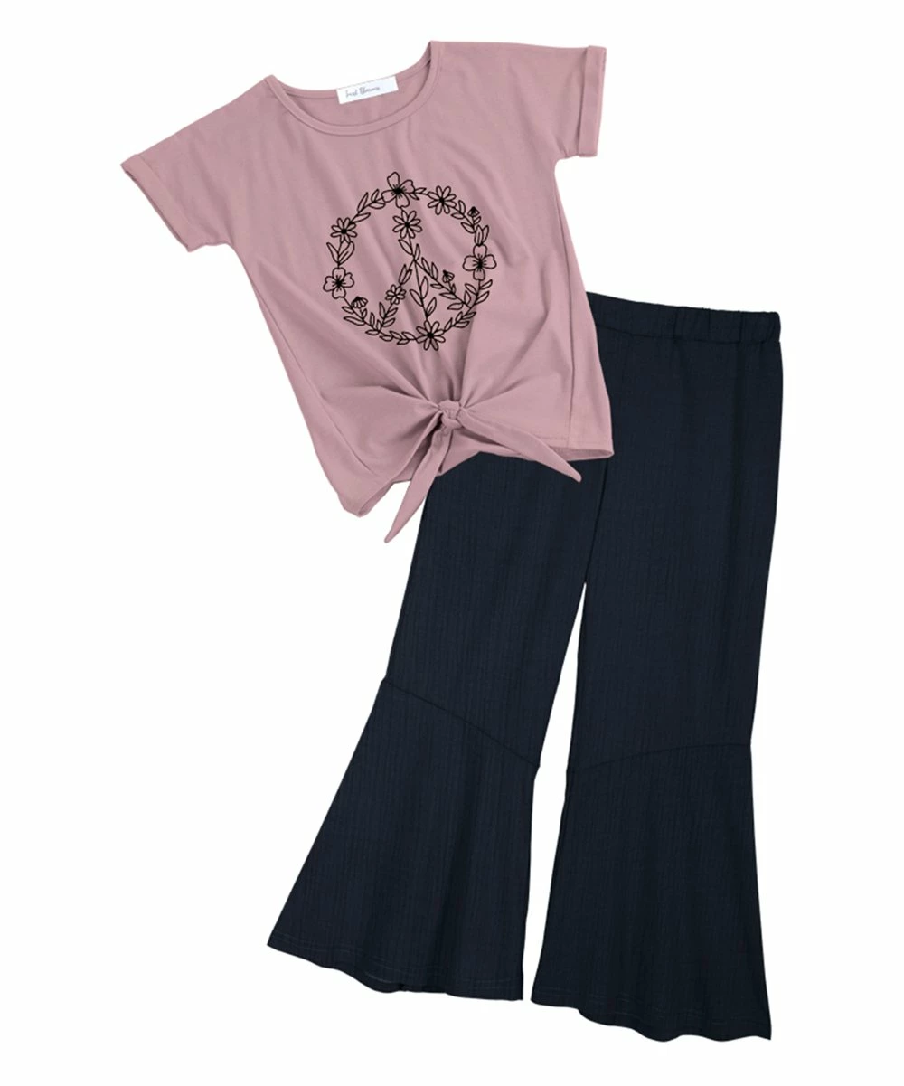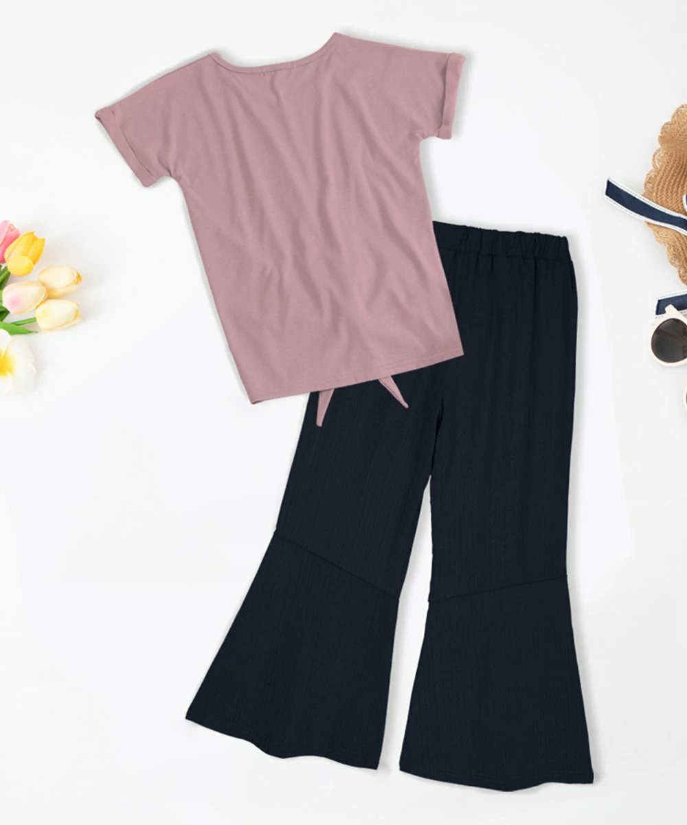 - Includes dusty pink floral peace knot-hem tee and navy flared pants (two pieces total)
