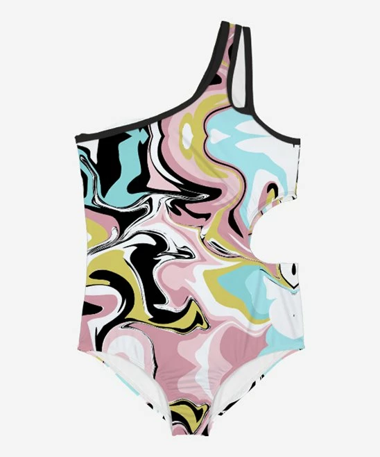 New 👏 Trend Blossoms Dusty Pink & Light Blue Swirl Asymmetrical Cut-Out One-Piece – 👧 Girls 🛒