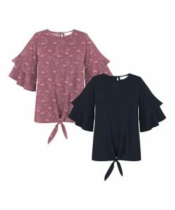 - Includes one pink floral ruffle-sleeve top and one navy ruffle-sleeve top (two pieces total)
