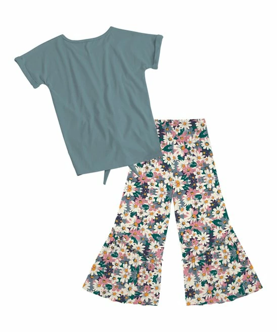 - Includes dusty turquoise top and pink floral pants (two pieces total)