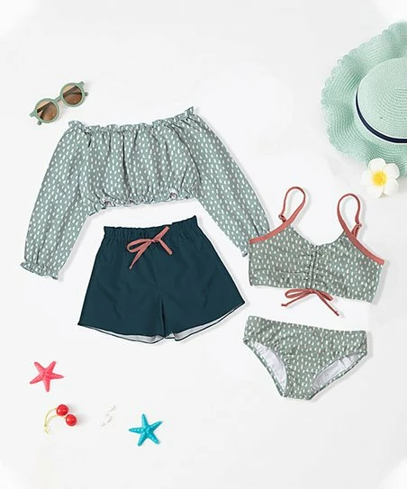 - Includes dusty turquoise speckled off-shoulder rashguard, teal drawstring swim shorts, dusty turquoise speckled bow-accented bikini top and bikini bottoms (four pieces total)