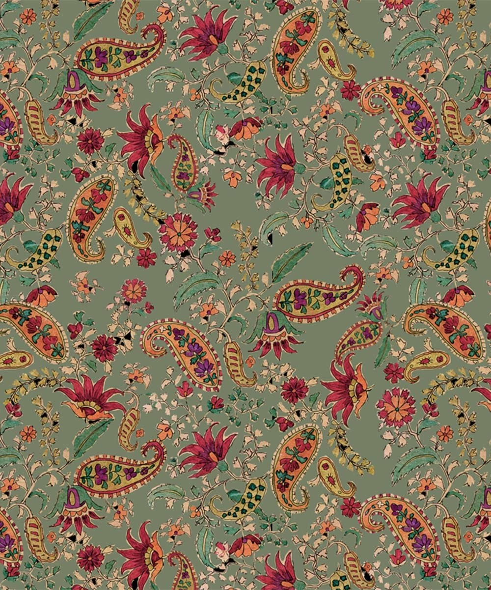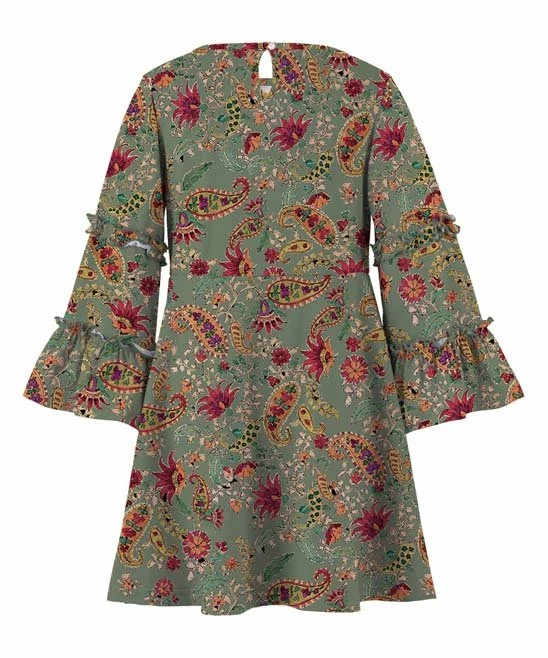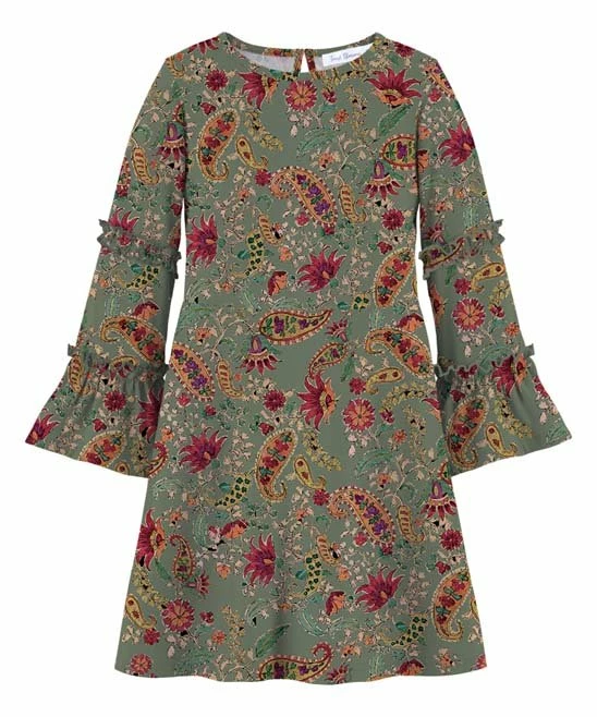 Bell sleeves and a ruffled trim on the upper arm lend this pailsey dress a classic feel.