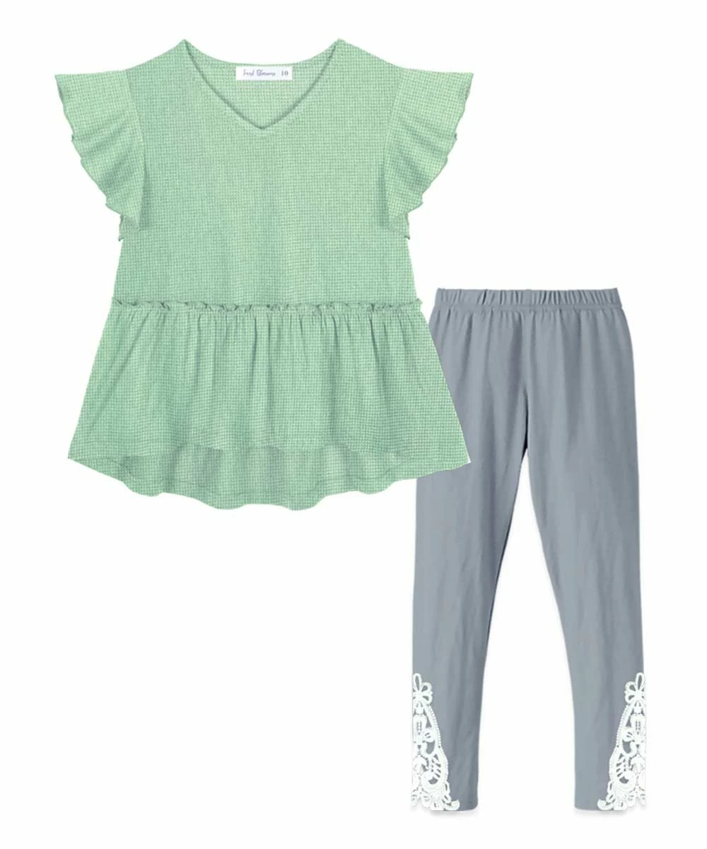 - Includes green ruffle-sleeve v-neck top and gray lace-hem leggings (two pieces total)