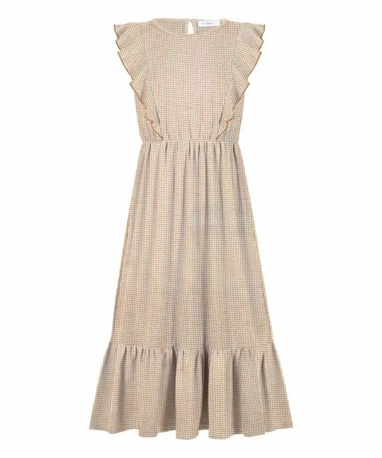 A ruffle trim that goes from the shoulders to waistline and a wide ruffled hem lend this maxi dress a vintage feel.