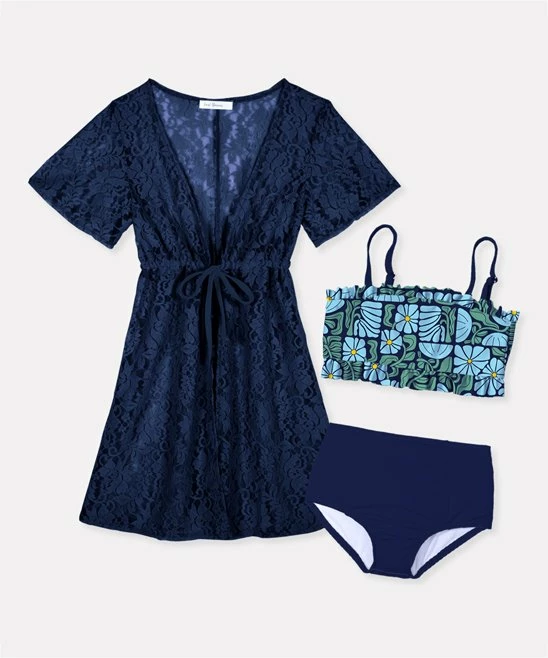 - Includes light blue floral bikini top, navy bikini bottoms and navy cover-up (three pieces total)