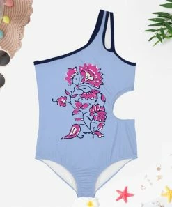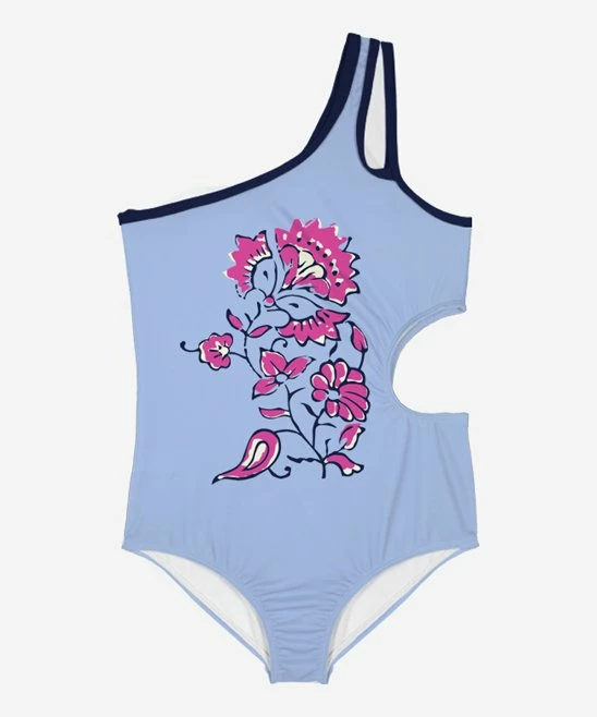 Bright one-piece featuring an asymmetrical one-shoulder design and rounded cut-out at the waist.