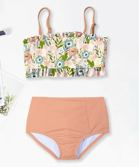 - Includes green floral bikini top and light coral solid bikini bottoms (two pieces total)