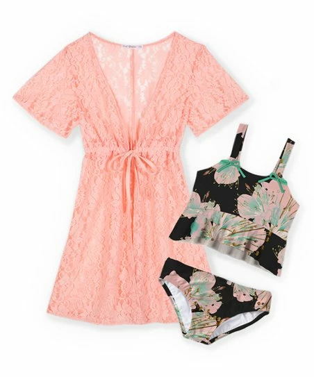 - Includes light pink cover-up dress and black and pink floral bikini top and black and pink floral bottoms (three pieces total)