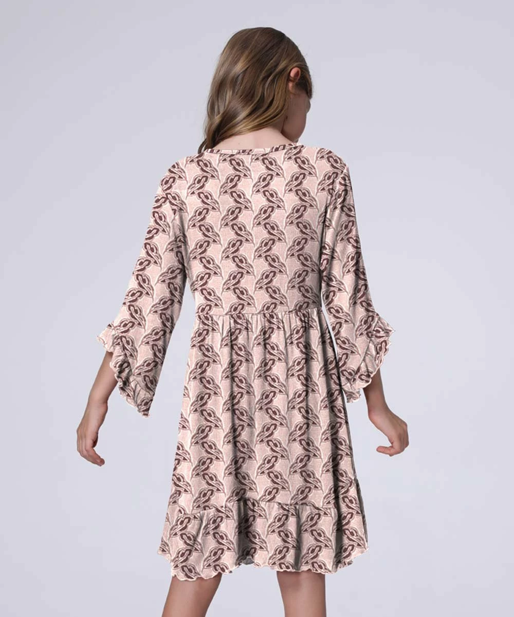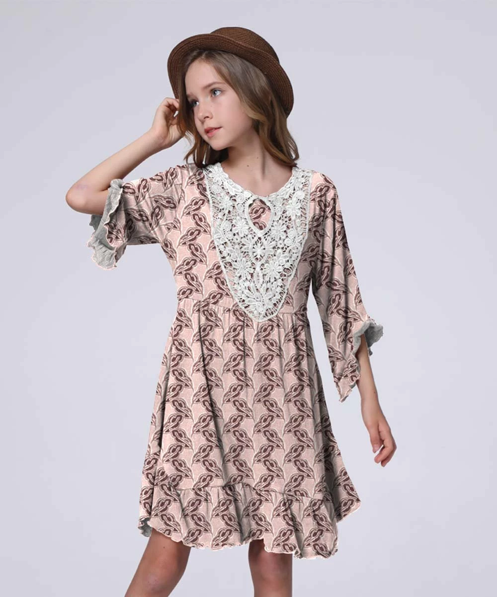 Leaf-print A-line dress featuring a lace overlay and light, stretch-infused fabric.