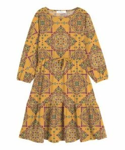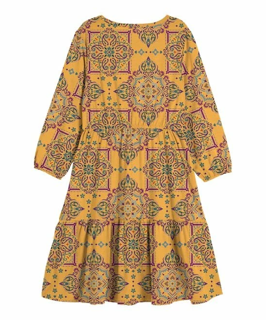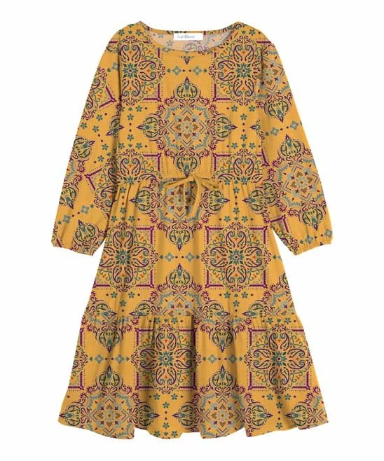 This flowy A-line dress features an eye-catching pattern finished with a playful bow-accent design.