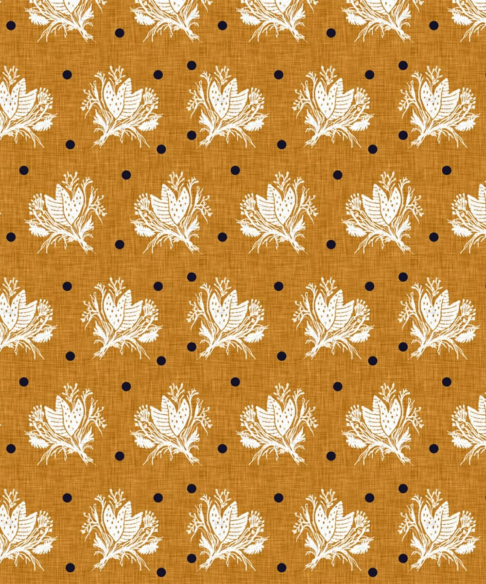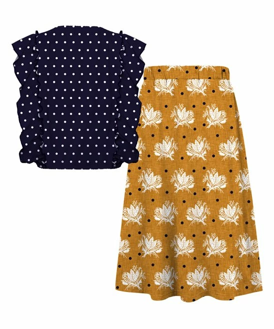 - Includes one navy polka-dot angel-sleeve top and one dark mustard and floral wrap skirt (two pieces total)