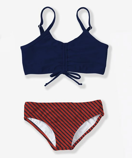 Bright bikini featuring adjustable spaghetti straps and a drawstring that ties in a cheerful bow at the ribs.