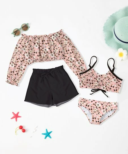 - Includes pink floral rashguard, black solid boardshorts, pink floral bikini top and pink floral bikini bottoms (four pieces total)