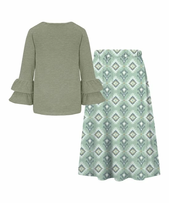 - Includes one sage green stripe long-sleeve top and one dusty mint ikat maxi skirt (two pieces total)