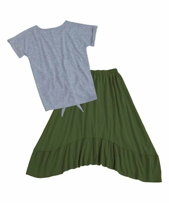 Sweeten your little one’s looks with this knot-front top’s colorful circle graphic and message. A coordinating hi-low skirt has a ruffle-hem detail.