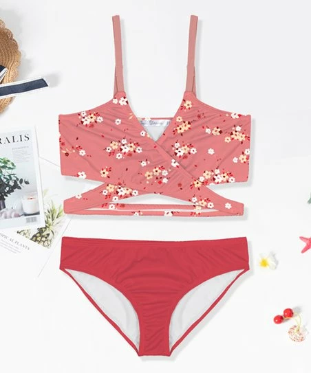 - Includes pink floral bikini top and watermelon solid bikini bottoms (two pieces total)
