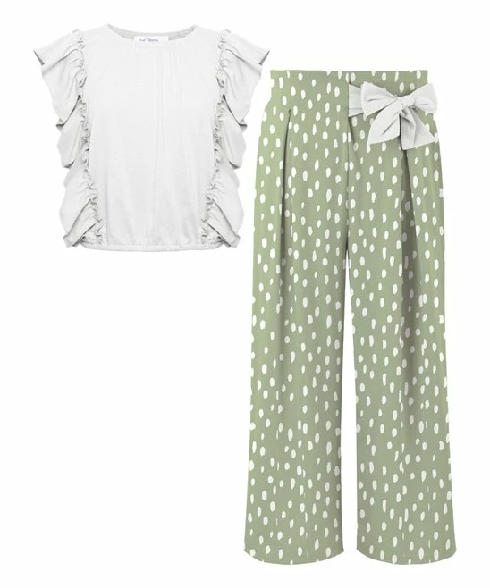 - Includes white angel-sleeve top and sage green dot pants (two pieces total)