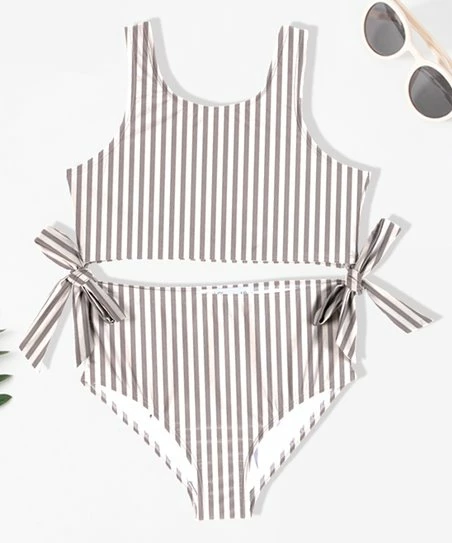 - Includes white and gray stripe bikini top and bottoms (two pieces total)