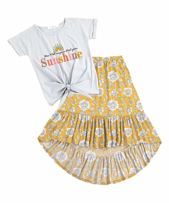 - Includes white front-tie crewneck tee and mustard and white floral ruffle-hem hi-low skirt (two pieces total)